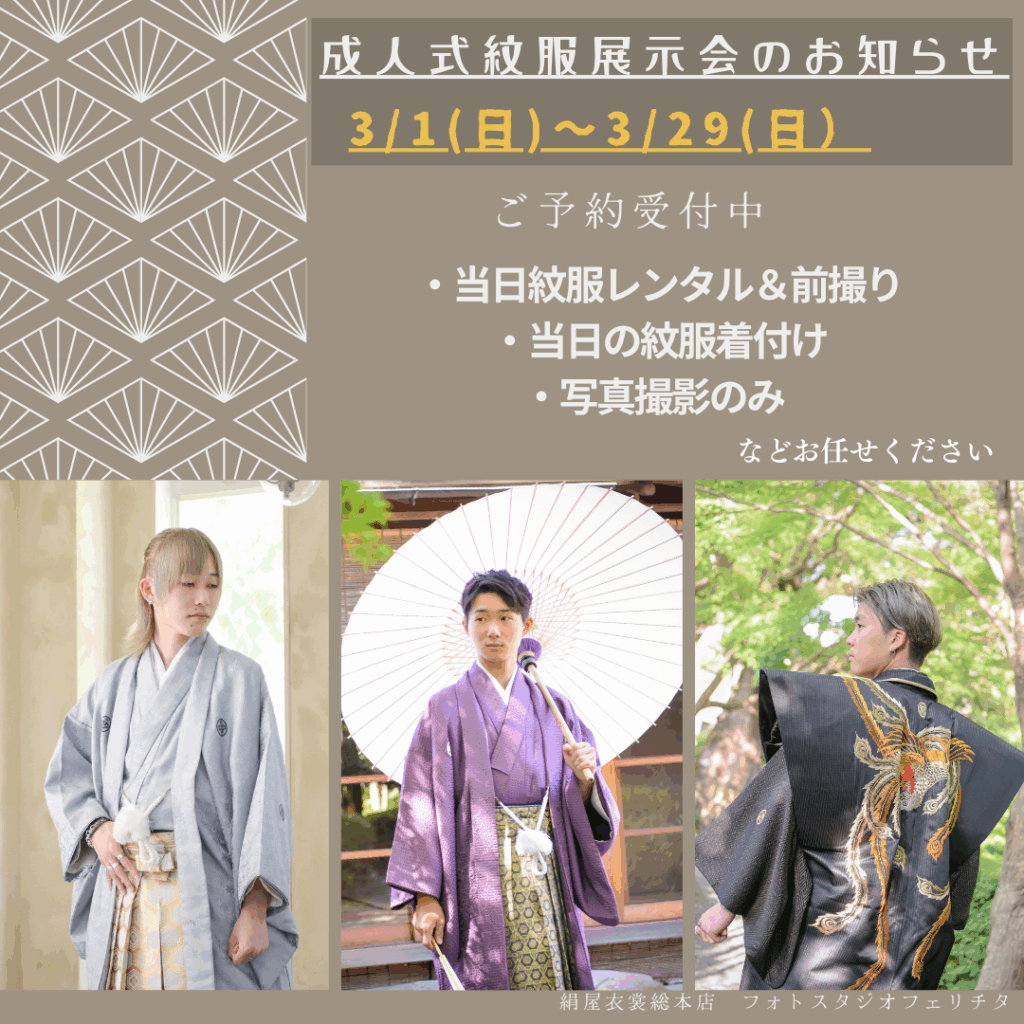 成人式☆紋服袴展示会【3月1日(日)〜3月29日(日)】◆2027 男性袴(紋付き袴)レンタル、撮影のみ、当日着付け等受付中◆