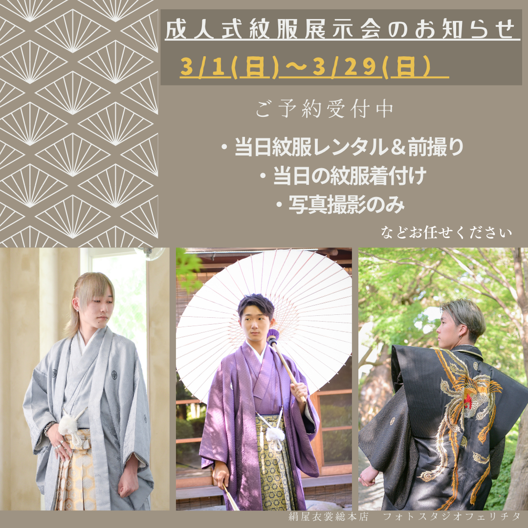 成人式☆紋服袴展示会【3月1日(日)〜3月29日(日)】◆2027 男性袴(紋付き袴)レンタル、撮影のみ、当日着付け等受付中◆