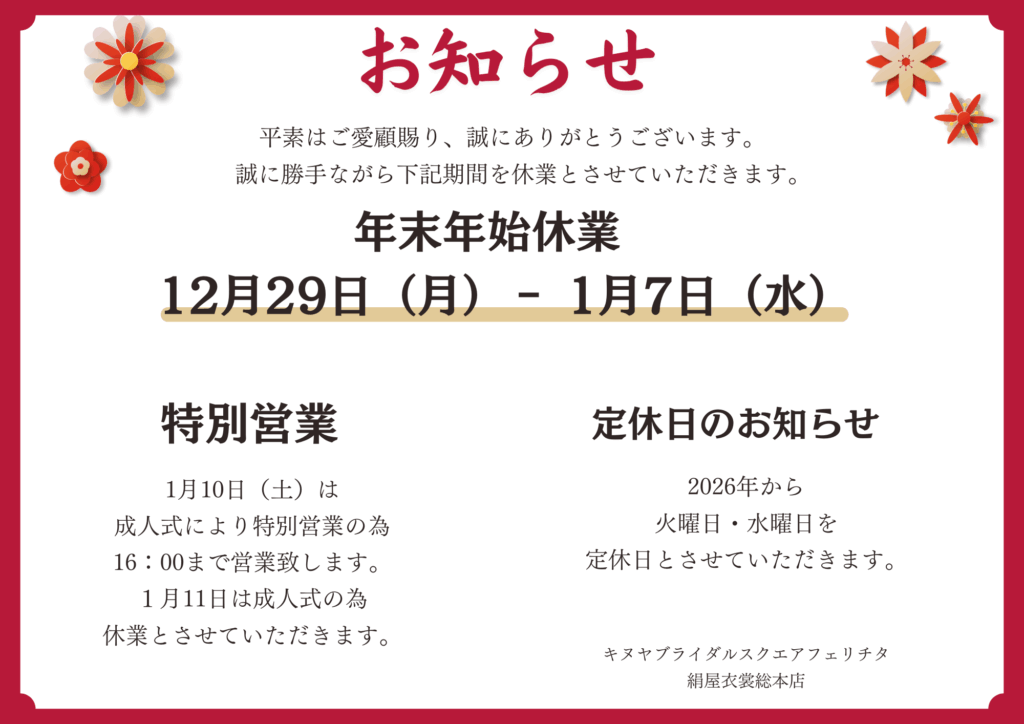 年末年始休業のお知らせ 2025年12月9日 こんにちは✨今年も残りわずかですね。2025年も絹屋衣裳総本店をご利用いただきありがとうございました。年末年始の休業のお知らせをいたします。12/29(月)~1/7(水)また2026年から火曜日・水曜日を定休日とさせていただきます。成人式により1/10(土)は16時まで・1/11(日)は成人式のお支度、ご返却のみの特別営業とさせていただきますのでよろしくお願いいたします。ご不明点ございましたらお気軽にお問い合わせください。絹屋衣裳総本店 お知らせ一覧へ戻る